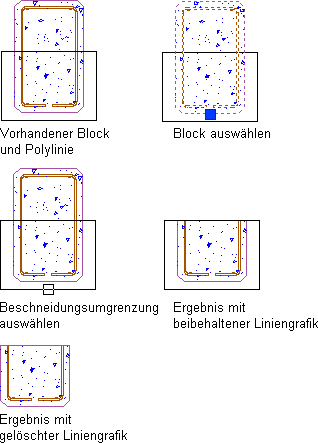 Alle Teile der ursprünglich gewählten Liniengrafiken, die außerhalb der Schnittumgrenzung liegen, werden gelöscht. Wenn Sie die Beschnittumgrenzung löschen, werden die Umgrenzungen für alle geschlossenen Objekte innerhalb der Beschnittumgrenzung neu gezeichnet. Die beschnittenen offenen Objekte bleiben aber weiterhin offen.