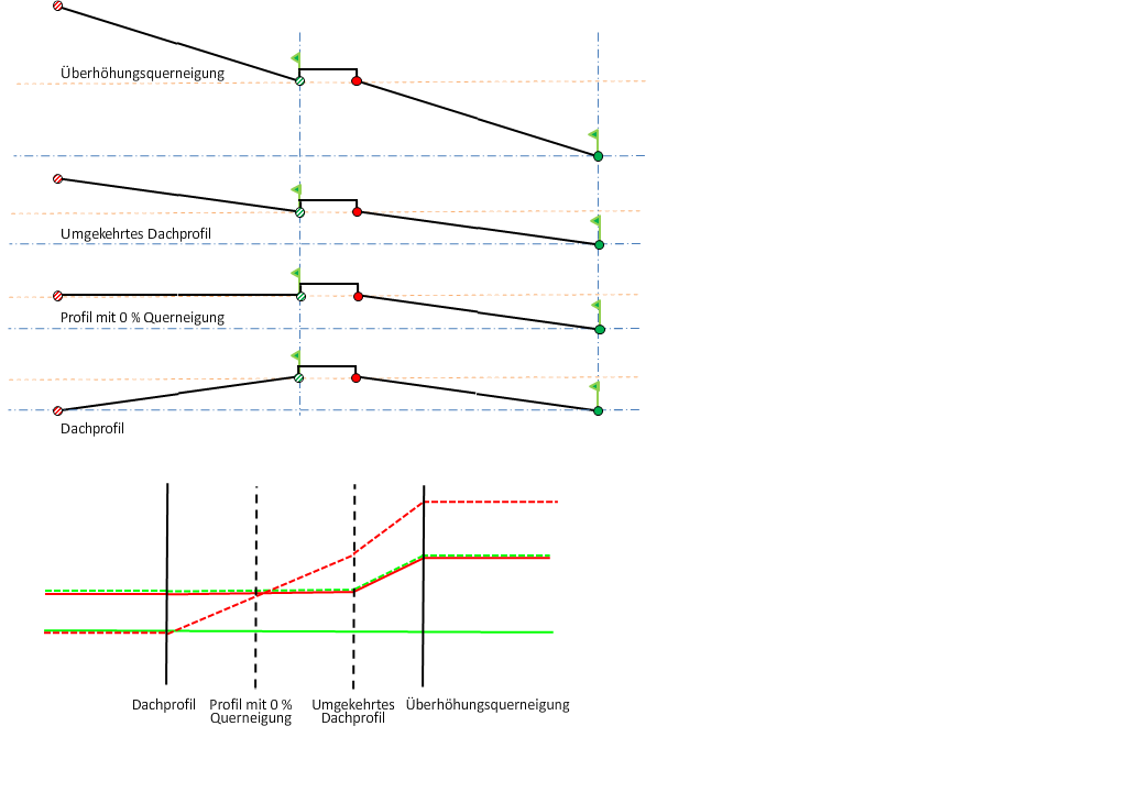 Die Option Mittelstreifenkontur beibehalten bewirkt, dass beim Anwenden einer Querneigung der Mittelstreifen angehoben wird, um die Querneigung zu berücksichtigen. Mit dieser Option werden die Mittelstreifenkontur beibehalten und die Drehpunkte erhöht oder verringert.