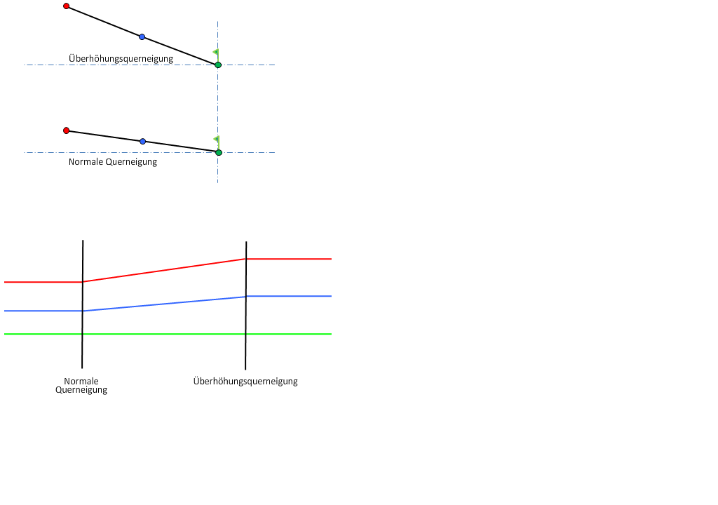 In der folgenden Abbildung wird die Drehpunktmethode Innenseite des Bogens für eine baulich nicht getrennte Straße mit Pultprofil beschrieben.