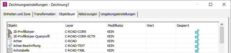 Bei der Erstellung eines Objekts können Sie die Vorgabe übernehmen oder einen neuen Layer angeben. Die Basisschichten werden nur für die Hauptobjekttypen, wie zum Beispiel DGMs und Achsen, verwendet.