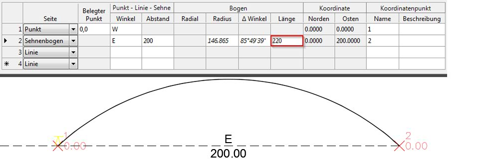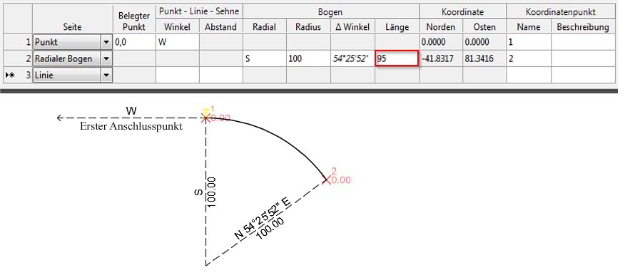 Durch die Änderung des Radius oder des Delta-Winkels wird die Länge neu berechnet. Durch die Änderung der Länge wird der Delta-Winkel neu berechnet.