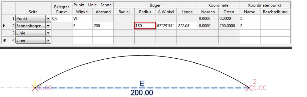 Bei der Eingabe von Daten für Sehnenbögen müssen Sie einen Winkel und einen Abstand eingeben und anschließend entweder einen Radius, einen Delta-Winkel oder eine Länge festlegen. Der von Ihnen direkt für Radius, Delta-Winkel oder Länge eingegebene Wert wird in normaler Schrift und die berechneten Werte in kursiv angezeigt. In der folgenden Abbildung wurde 180 für den Radius eingegeben, wodurch der Delta-Winkel 67 ° 29' 53" und die Länge 212.05 berechnet wurden.