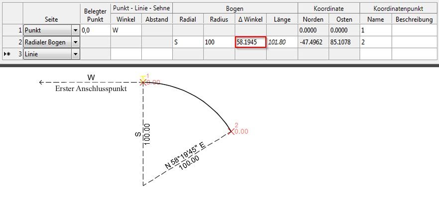 Bei der Eingabe von Daten für radiale Bögen müssen Sie eine radiale Richtung und einen Radius und entweder einen Delta-Winkel oder eine Länge angeben. Der direkt für den Delta-Winkel oder die Länge eingegebene Wert wird in normaler Schrift und die berechneten Werte in kursiv angezeigt.