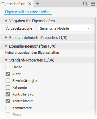 Eigenschaftengruppen-Beschriftungen zeigen die Anzahl der für den Export ausgewählten Eigenschaften sowie die Gesamtzahl der für den Export verfügbaren Eigenschaften an. Mit Benutzerdefinierte iProperties (3/18) werden beispielsweise drei ausgewählte Eigenschaften aus einer Liste mit 18 verfügbaren benutzerdefinierten iProperties gekennzeichnet.