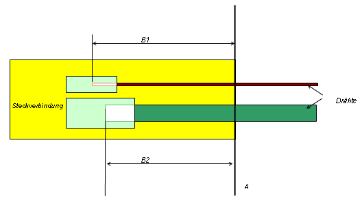 B. Der Abstand zwischen Ebene A und dem Punkt, an dem der eingefügte Draht endet. Je nach Tiefe der Kavität kann B bei einer Verbindung mit verschiedenen Kavitätsgrößen für jeden eingefügten Draht unterschiedlich sein. In diesem Beispiel könnte B entweder B1 oder B2 entsprechen.