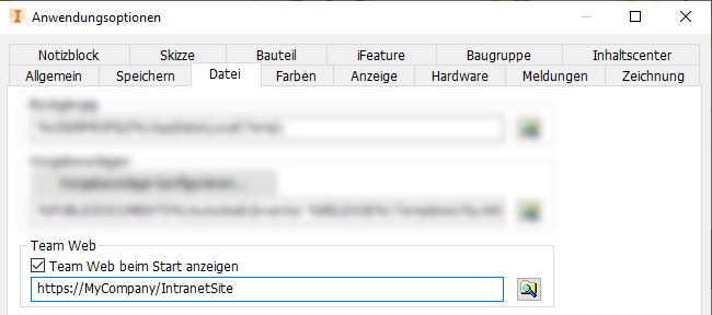Aktivieren Sie das Kontrollkästchen, um den Startbildschirm der Ausgangsansicht von Inventor durch die angegebene Team Web-Seite zu ersetzen.