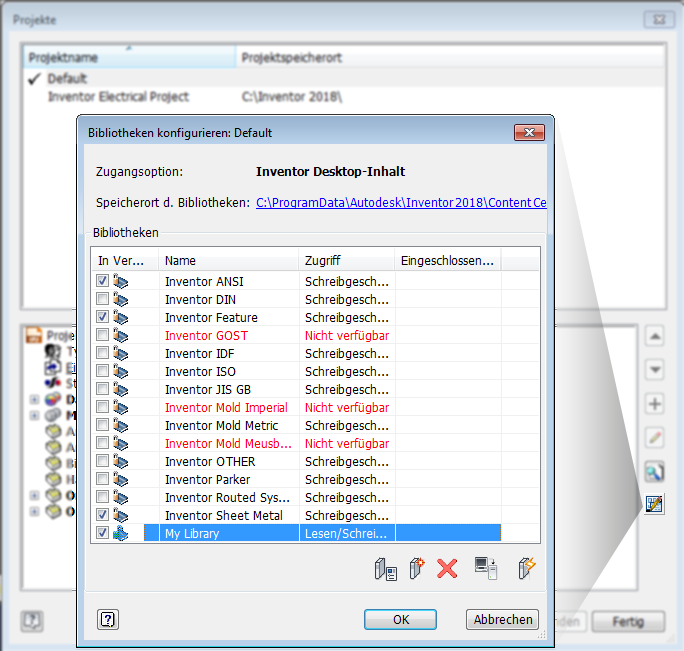 Wenn der Speicherort für die Arbeitsgruppe oder Bibliothek ein Unterordner eines anderen definierten Speicherorts ist, hebt Inventor den entsprechenden Pfad in Rot hervor. Sie können die Projektdatei trotzdem speichern. Es handelt sich lediglich um eine Warnung, dass der gewählte Speicherort für keine besonders effiziente Dateistruktur sorgt.