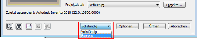 Sie können auch die Optionen zum Öffnen von Dateien verwenden, um für das Öffnen der Baugruppe den Modus Vollständig oder Express anzugeben. Der Zugriff auf Datei öffnen - Optionen erfolgt über das Fenster Startseite