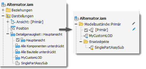 In der folgenden Abbildung wird die primäre Detailgenauigkeit in den primären Modellzustand konvertiert. Die benutzerdefinierte Detailgenauigkeit und die Ersatz-Detailgenauigkeit werden in Modellzustände mit demselben Namen konvertiert. Die drei systemdefinierten Detailgenauigkeiten, die alle Komponenten, alle Bauteile und das gesamte Inhaltscenter unterdrückt haben, werden entfernt.