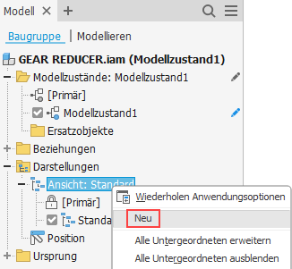 Erweitern Sie im Modell-Browser der Baugruppe die Option Darstellungen, klicken Sie mit der rechten Maustaste auf Ansicht, und wählen Sie dann im Kontextmenü Neu aus.