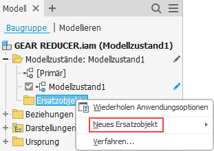 So erstellen Sie einen neuen Ersatzobjekt-Modellzustand: Erweitern Sie den Ordner Modellzustände, klicken Sie mit der rechten Maustaste auf Ersatzobjekte, wählen Sie Neues Ersatzobjekt und dann Baugruppe ableiten, Vereinfachen, oder Bauteildatei wählen aus.