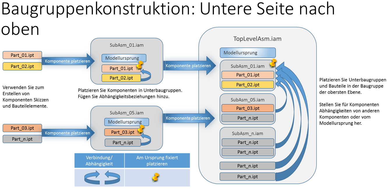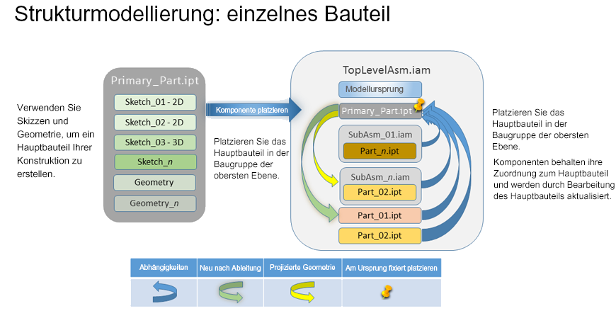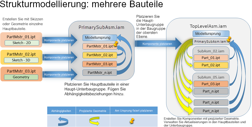 Im mehrstufigen Prozess werden einzelne primäre Bauteile verwendet, die Skizzen zur Darstellung der endgültigen Baugruppe umfassen. Die primären Bauteile werden in einer primären Unterbaugruppe platziert und mit Abhängigkeiten versehen. Die primäre Unterbaugruppe wird in der Baugruppe der obersten Ebene platziert. Innerhalb der Baugruppe der obersten Ebene werden die einzelnen 3D-Komponenten mithilfe projizierter Geometrie aus der primären Unterbaugruppe und deren primären Bauteilen modelliert. Die 3D-Komponenten können je nach den Konstruktionsanforderungen in logischen Unterbaugruppen enthalten oder separat abgelegt sein.
