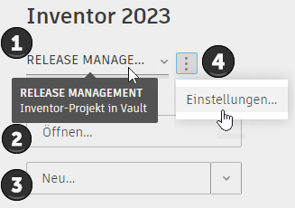 Klicken Sie auf Öffnen, um nach einem Dokument zu suchen, das Sie zum Bearbeiten oder Anzeigen öffnen möchten. Wenn Sie während der Inventor-Sitzung ein Dokument öffnen (lokal oder über Vault), bleibt die zuletzt zum Öffnen der Datei verwendete Option beim nächsten Öffnen eines Dokuments erhalten.