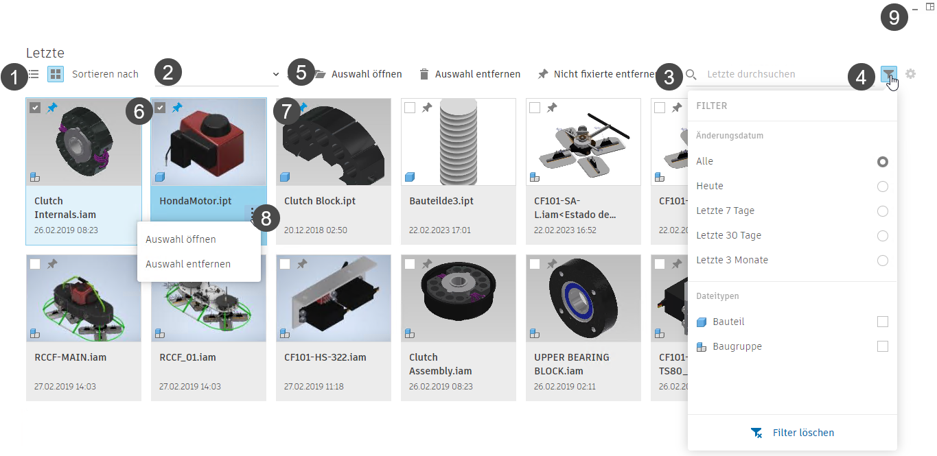 Filter löschen setzt alle Filter auf die Vorgabewerte zurück, und alle zuletzt verwendeten Dateien werden in der Liste angezeigt.