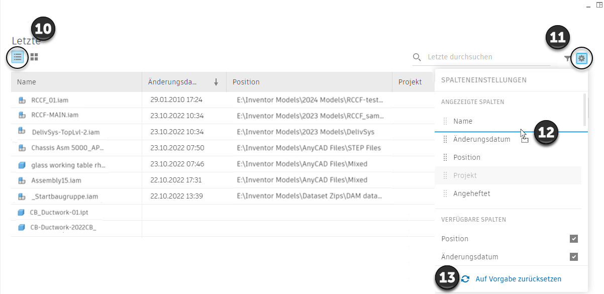 Klicken Sie auf die Dropdown-Liste, um nach Änderungsdatum, Name, Position oder iProperties zu sortieren. Klicken Sie auf den Pfeil, um in auf- oder absteigender Reihenfolge zu sortieren. Klicken Sie in der Listenansicht auf die Spaltenüberschrift, die Sie sortieren möchten. Die Vorgabeeinstellung für die Sortierung ist das Datum der letzten Öffnung.