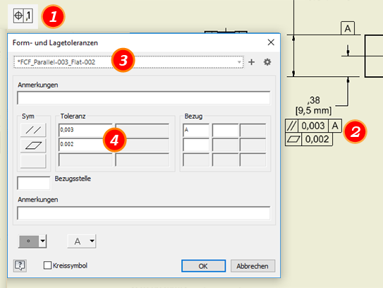 Legen Sie die Attribute und Werte für das Symbol im Dialogfeld Form- und Lagetoleranzen fest, und klicken Sie auf OK.