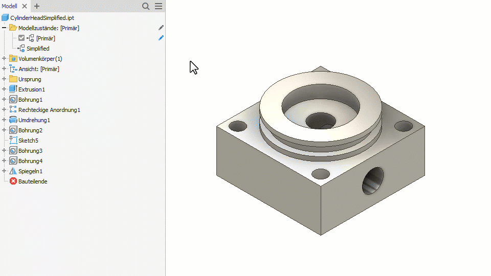 Sie können die Bauteilmodellzustände zum Erfassen von Fertigungsprozessen, zum Erstellen vereinfachter Versionen eines Bauteils oder zum Erstellen von Bauteilfamilien verwenden.