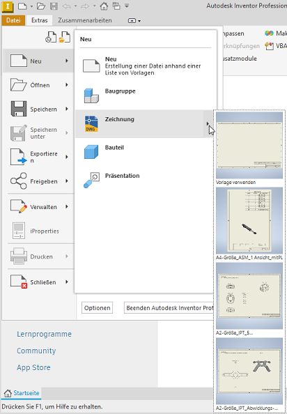 Bewegen Sie den Mauszeiger im Flyout Neu über Zeichnung, um die Optionen für Vorlage und Arbeitsblattformat anzuzeigen.