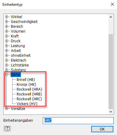 Härte ist ein neuer Einheitentyp, der in dieser Version von Inventor hinzugefügt wurde. Dadurch kann die Härte im Befehl Oberfläche angegeben, aber auch einzeln verwendet werden. Die folgenden Typen sind im Dialogfeld Parameter verfügbar: