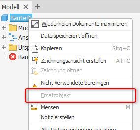 Diese Änderung wirkt sich auf Bauteildokumente aus. Daher wird auch in einem neuen Bauteildokument im Kontextmenü der schreibgeschützte Status Ersatzobjekt angezeigt. Er ist deaktiviert.