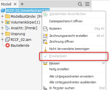 Wenn ein Bauteil oder eine Baugruppe mithilfe von Ableiten oder Vereinfachen als Ersatzobjekt erstellt wird, erhält die resultierende Komponente den schreibgeschützten Status Ersatzobjekt. Der Status Ersatzobjekt wird im Komponenten-Kontextmenü angezeigt.
