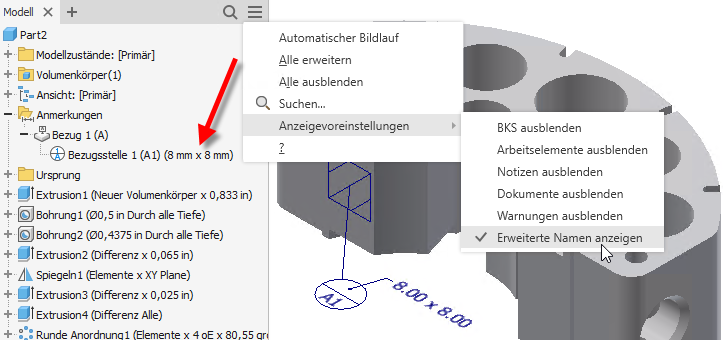 Alle 3D-Anmerkungen werden in einem Ordner im Modell-Browser platziert. Alle 3D-Anmerkungen können durch Alle Anmerkungen ausblenden im Kontextmenü des Ordners ausgeblendet werden.