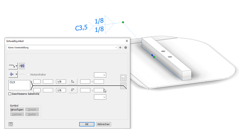 Viele 2D-Schweißsymbole in Zeichnungen wurden gemäß ISO/BSI/DIN/GB-Normen aktualisiert. Für 3D-Schweißsymbole in Baugruppen gelten ISO/DIN-Normen. Zu den Änderungen zählen das Aktualisieren der Feldnamen und das Hinzufügen neuer Felder je nach ausgewähltem Schweißnahttyp. Die Änderungen wurden beispielsweise für I-Nähte, Kehlnähte oder Lochnähte vorgenommen.