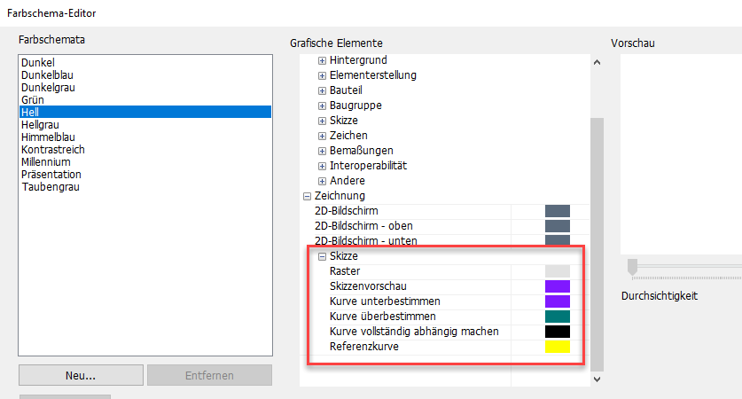 In dieser Version können Farbschemaeinstellungen für Zeichnungsskizzierelemente festgelegt werden. Bisher war es schwierig, mit Elementen zu arbeiten, wenn ihre Farbe mit der Einstellung für die Blattfarbe in Konflikt stand. Mit den neuen Skizzieroptionen unter der Überschrift Zeichnen können Sie die Farbe von Skizzierelementen für die Zeichnungsumgebung festlegen.