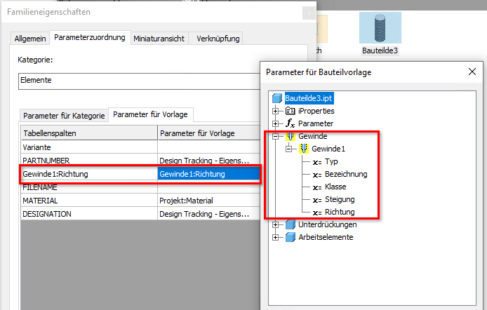 Sie können nun die Gewinderichtung (links oder rechts) den Parametern für Bauteilvorlagen zuordnen.