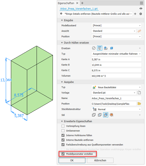Die neue Option Modellparameter erstellen wurde in der Gruppe Eigenschaften unter Erweiterte Eigenschaften hinzugefügt. Wenn diese Option ausgewählt ist, werden in der vereinfachten Datei drei schreibgeschützte Parameter für Kante A, Kante B und Kante C erstellt.