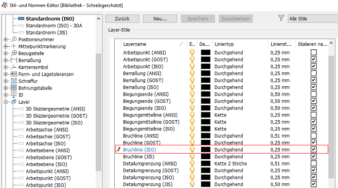 Außerdem wurde der Objekttyp Ausschnittansichtslinie für ISO-Normen geändert. Bisher war der Layer Sichtbar unter Dicke auf 0,5 mm eingestellt. Gemäß der aktualisierten Norm wird jetzt der Objekttyp Ausschnittansichtslinie auf dem Layer Bruchlinie mit einer Dicke von 0,25 mm festgelegt. Dies gilt auch für DIN/GB/JIS-Normen.