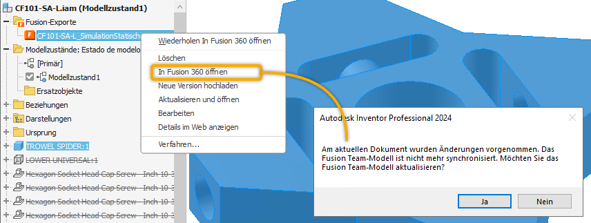 Wenn eine Änderung am Inventor-Modellzustand oder der Konstruktionsansicht für einen Fusion 360-Export vorgenommen wurde und Sie im Kontextmenü Exportieren auf In Fusion 360 öffnen klicken, werden Sie darauf hingewiesen, dass das Inventor-Modell und das Fusion 360-Modell nicht synchronisiert sind. Sie erhalten die Möglichkeit, das Fusion 360-Modell vor dem Öffnen zu aktualisieren.