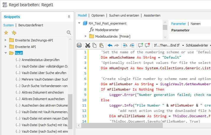 Mit Inventor 2024 ist die Arbeit mit Vault so einfach wie noch nie. Neue Funktionen in iLogic ermöglichen es Inventor, Dateien auszuchecken, abzurufen, Vault zu durchsuchen und vieles mehr als Teil Ihrer Automatisierungen. Die im Editor hinzugefügten Vault-Code-Snippets erleichtern den schnellen Einstieg.