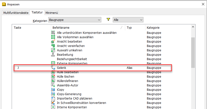 Die Taste J ist nun als Tastenkürzeln zugewiesen, um den Befehl Gelenk platzieren in Baugruppen, Schweißkonstruktionen und der dynamischen Simulation aufzurufen.