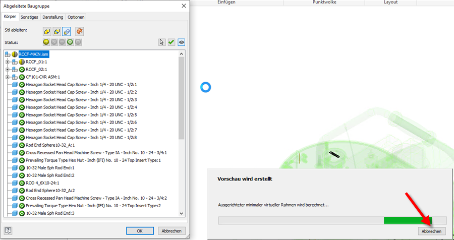 Sie können die Vorschau des ausgerichteten minimalen virtuellen Rahmens abbrechen, wenn Sie ein Bauteil oder eine Baugruppe ableiten und eine Baugruppe vereinfachen.
