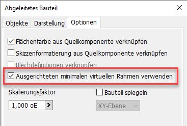 Sie können einen Volumenkörper als ausgerichteten minimalen virtuellen Rahmen ableiten. Die neue Option Ausgerichteter minimaler virtueller Rahmen wurde der Registerkarte Optionen in den Dialogfeldern Abgeleitetes Bauteil, Baugruppe ableiten und Bauteil erstellen hinzugefügt. Die Option ist vorgabemäßig aktiviert. Deaktivieren Sie das Kontrollkästchen, um einen Körper als orthogonalen virtuellen Rahmen abzuleiten.