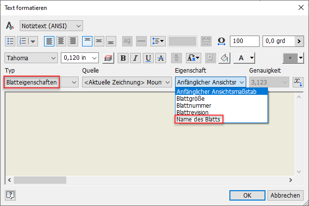 Der Blattname wird als Blatteigenschaft hinzugefügt und kann in Text verwendet werden.
