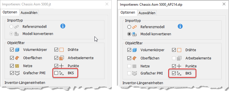 Sowohl JT als auch STEP unterstützen die Option, ein BKS beim Import einzuschließen.