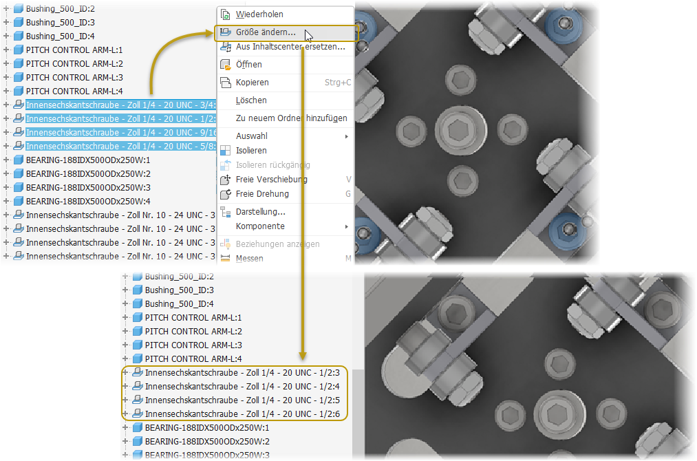 Sie können nun mehrere Inhaltscenter-Komponenten derselben Familie auswählen und die Größe aller ausgewählten Komponenten in eine gemeinsame Größe ändern. Größe ändern wird aktiviert, wenn alle ausgewählten Komponenten unabhängig von ihrer Größe zur selben Familie gehören. Das Dialogfeld Komponente wird mit den Parametern der ersten ausgewählten Komponente ausgefüllt.
