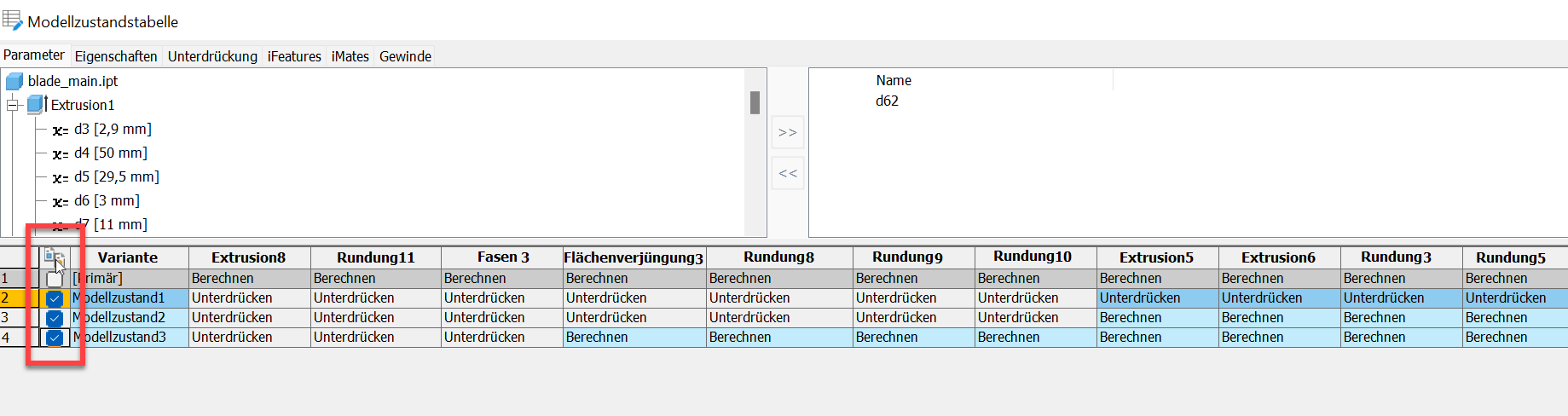 Beim Bearbeiten einer iComponent- oder Modellzustandstabelle wurde eine neue Spalte Vergleichen mit einem Kontrollkästchen zum Auswählen von Zeilen hinzugefügt. Vorgabemäßig sind alle Zeilen deaktiviert. Aktivieren oder deaktivieren Sie die Zeilen, die Sie dem Vergleich hinzufügen oder aus dem Vergleich entfernen möchten.