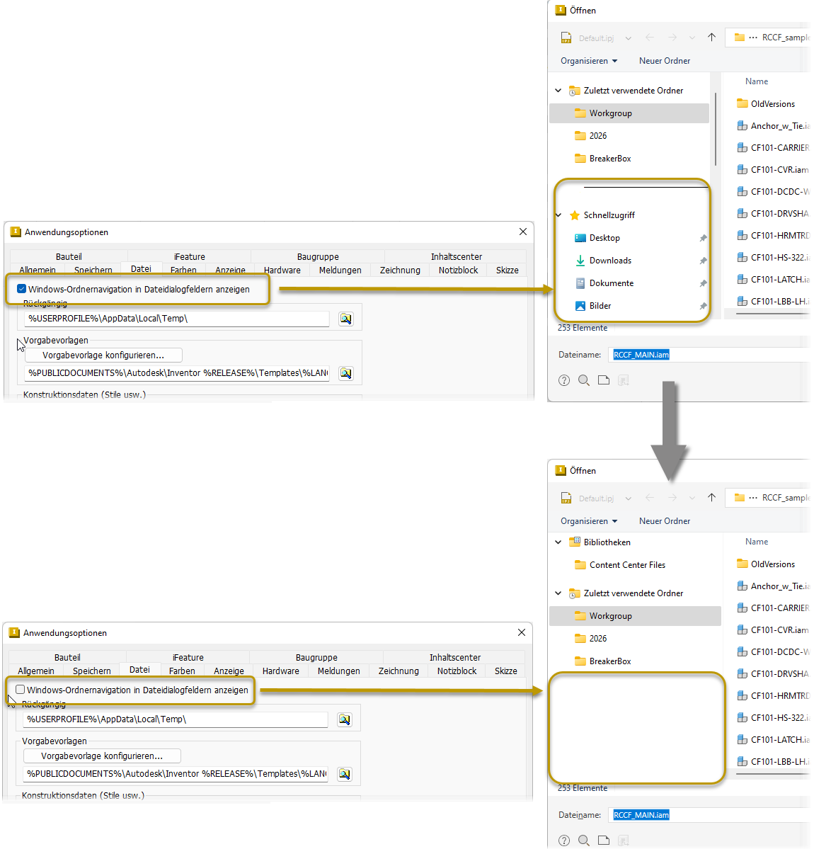 Sie können jetzt die Anzeige des Windows-Navigationsbereichs im Dialogfeld Öffnen mit der neuen Einstellung Anwendungsoptionen > Registerkarte Dateien Windows-Ordnernavigation in den Datei-Dialogfeldern anzeigen steuern.
