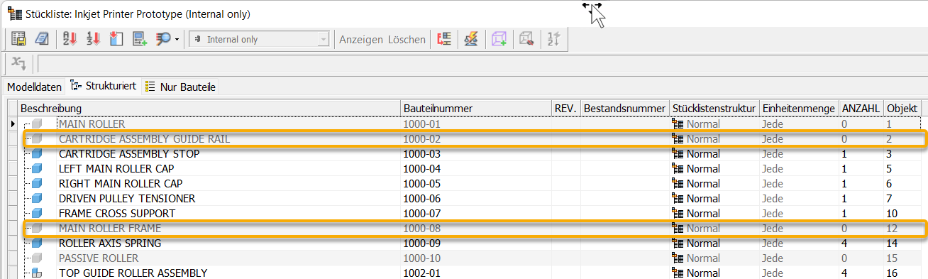 Es ist jetzt einfacher, Elemente mit der Menge null in der Stückliste zu unterscheiden. Die Hintergrundfarbe für Zeilen mit der Menge null unterscheidet sich von der für andere Zeilen.