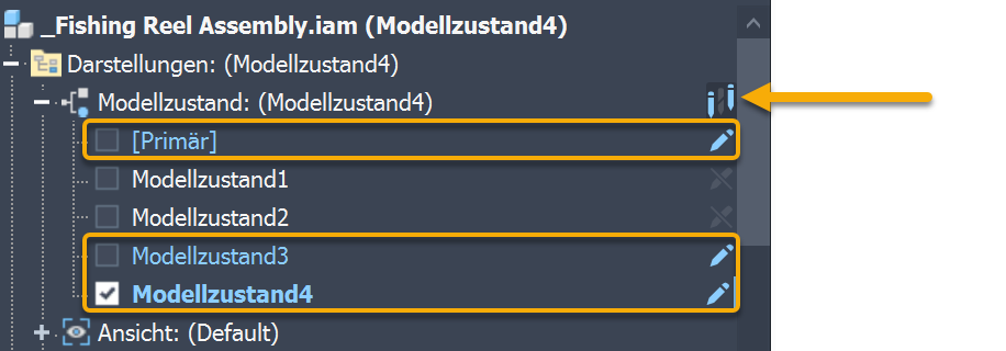 Bisher war es schwierig, beim Anzeigen des Texts schnell zu erkennen, welche Modellzustände bearbeitet wurden. Jetzt wird der bearbeitete Modellzustand blau angezeigt. Beachten Sie, dass diese Änderung nur für Modellzustände gilt und keine Auswirkungen auf iComponents, Ansichten oder Positionen hat.