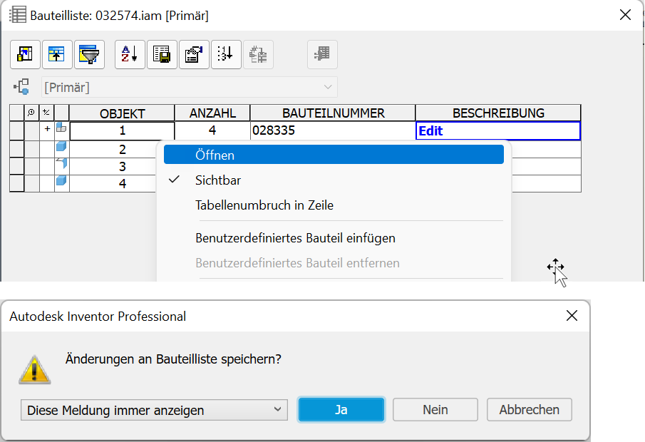 Beim Schließen einer Bauteilliste mit nicht gespeicherten Änderungen wird jetzt eine Eingabeaufforderung angezeigt, die davor warnt, dass nicht gespeicherte Änderungen vorhanden sind, die gespeichert werden müssen.