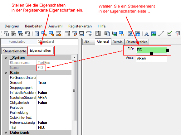 Auf der Registerkarte Eigenschaften können Sie die Eigenschaften der einzelnen Steuerelemente definieren.