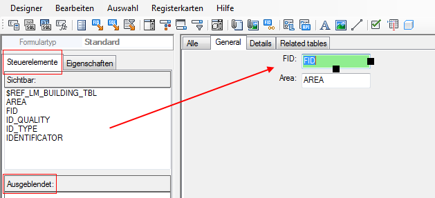 Wenn Sie im Formular-Designer ein Objektklassenformular bearbeiten, werden zwei Fenster angezeigt: das Objektklassenformular und das Dialogfeld von Designer. Im rechten Fensterbereich des Dialogfelds von Designer werden alle Steuerelemente (Eingabefelder, Steuerelemente, Schaltflächen usw.) des Formulars angezeigt. Im linken Fenster können Sie die einzelnen Elemente verarbeiten.