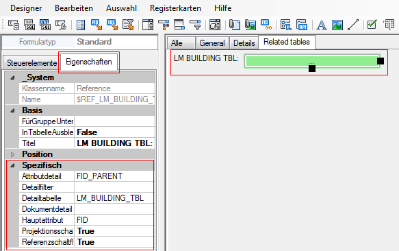 Der zweite Typ von Steuerelementen ermöglicht den Zugriff auf Datensätze, die mit dem aktuellen Datensatz verknüpft sind. Diese Steuerelemente werden für jede Relation erstellt, wobei Sie jedoch weitere Steuerelemente definieren können. So wird für Labelobjektklassen zum Beispiel vorgabegemäß ein Referenzsteuerelement definiert.