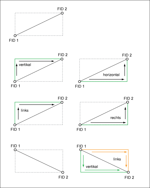 Die Richtung der Linien zwischen zwei Punkten wird von der FID abgeleitet. Eine Linie wird beispielsweise von FID 1 zu FID 2 erstellt. Sie kann dabei entweder vertikal oder horizontal verlaufen, und sie kann nach links oder rechts in Richtung des Reale-Welt-Objekts gezeichnet werden.
