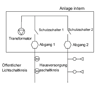 Sie haben die Möglichkeit, eine separate Zeichnung mit einer Ansicht des Innenlebens einer Anlage zu erstellen. Beispiel: Es existiert eine Unterstation, bei der ein Leitungsabschnitt in einer Trasse mit einem internen Gerät (Transformator/Schutzschalter/Sicherung) verbunden ist. Die internen Geräte sind untereinander mit einem Leitungsabschnitt verbunden.