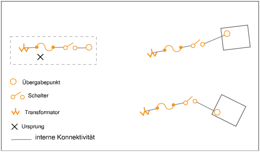 Beispiel: Diese Vorlage für eine elektrische Objektanordnung besteht aus einem Transformator, zwei Verteilern und zwei Leitungsabschnitten. Mit dieser Vorlage können Sie die fünf Objekte instanziieren und deren Attribute und Verbindungen mit einem einzigen Mausklick übernehmen. Die Vorlage ist gruppiert: Sie können sie wie ein einzelnes Objekt anordnen und verschieben. Anschließend können Sie mit dem Digitalisieren der Leitungsabschnitte fortfahren.